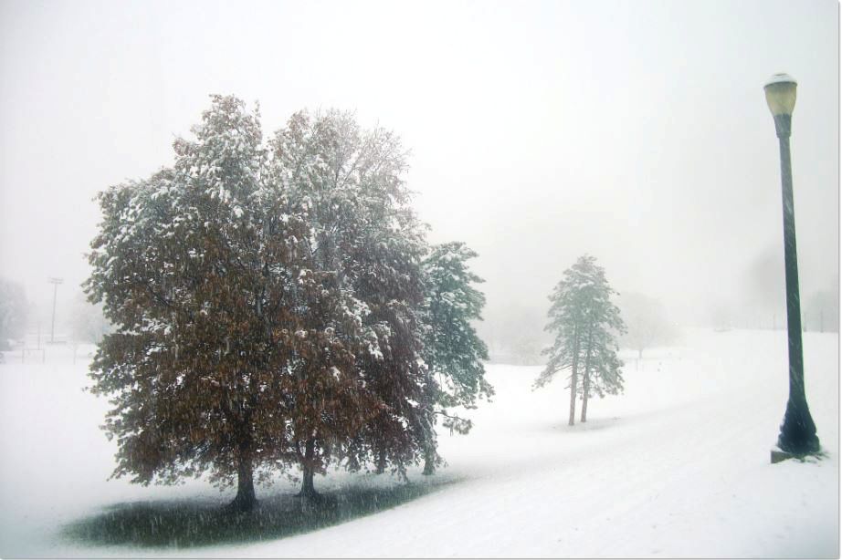 The trees are bare and vulnerable to the icy caress